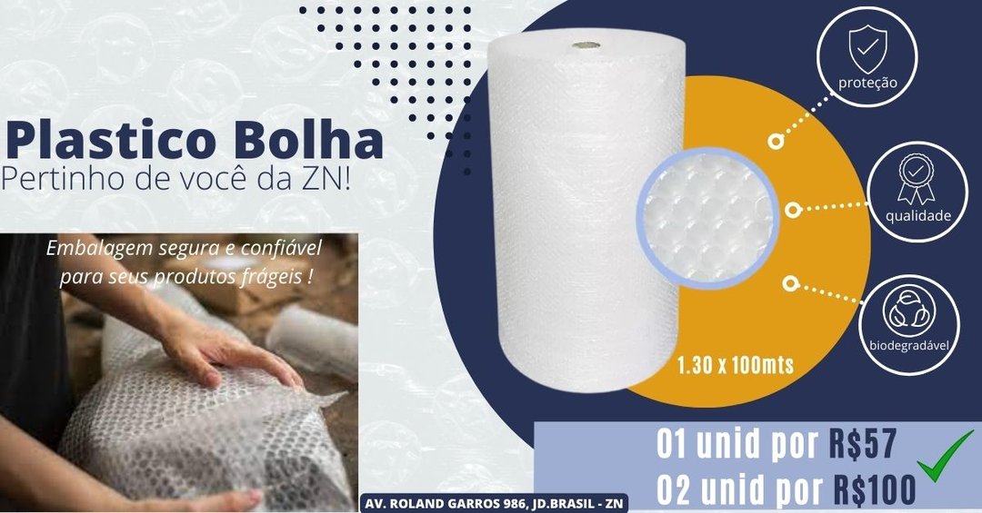 Na Rogapel Embalagens, você encontra plástico bolha barato em Jardim Brasil e região da Zona Norte de SP, ideal para mudanças, artesanato, jardinagem e envio de produtos pelos Correios. Trabalhamos com rolos de plástico bolha em diversos tamanhos, sempre em estoque e com entrega rápida no mesmo dia. Além do plástico bolha, oferecemos caixas de papelão, kits mudança completo, fitas adesivas, papelão ondulado, filme stretch, sacolas plásticas, saco de lixo reforçado, sacos plasticos. Se você busca onde comprar plástico bolha próximo a você, temos atendimento imediato nos ligue, retirada rápida na loja ou entrega em toda a Zona Norte. Estamos abertos agora para atender clientes residenciais e empresas que precisam de embalagens de qualidade.